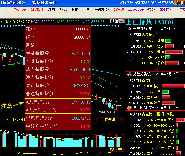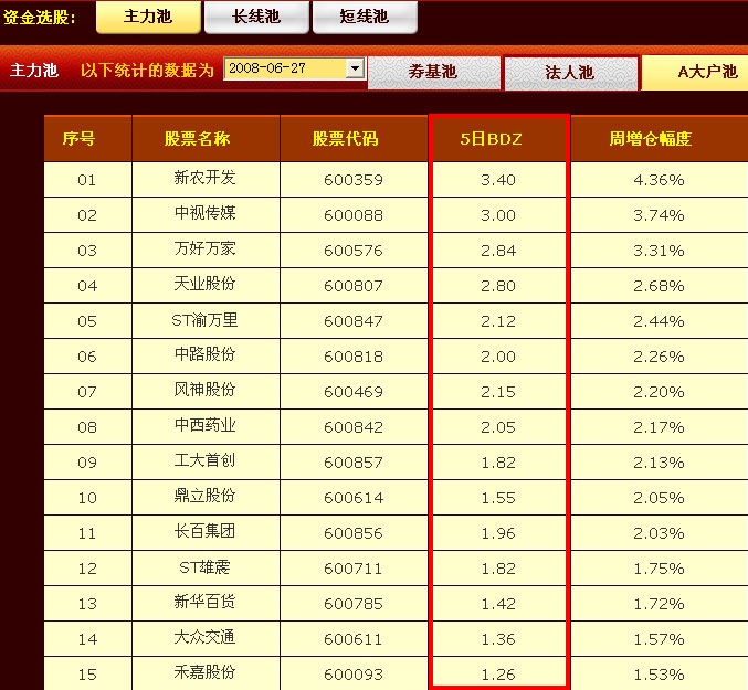 我们可以发现6月26日—7月4日这段时间里,券基持股比例减少0.31%,法人持股减少0.21%,A大户持股增加0.66%,因此非常快速的判断A大户才是目前市场做多的主力资金,只有操作A大户控盘股才相对安全。因此我们在后面就选A大户参与的个股进行分析,对BDZ指标背离高的个股进行跟踪。(BDZ就是A大户的BDL。)