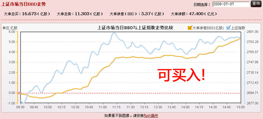 如图(二),黄色的BBD曲线上午10点后开始持续上行,大单资金流入明显,买入时机已到,我们可以确定此时介入属于比较安全的。整天大单资金流入47.4亿元。